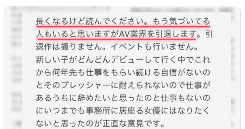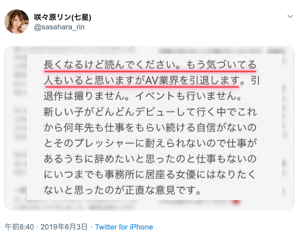 為什麼不想幹了呢?咲々原リン(咲咲原凜)說在這個每天都有新人出道的業界工作壓力遠超過外界想像,她也出道一年了,與其變成每天坐在事務所沒事做的累贅還不如自己先閃人為妙: