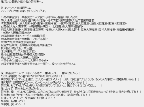 原來,就和市川まさみ(市川雅美)一樣,她遇到讓人很害怕的影迷了:大家還記得市川的事嗎?有一位在大阪上班的40歲男性三不五時就宣稱這位恵比寿マスカッツ(惠比壽麝香葡萄)的隊長入侵手機妨礙他的生活,所以他帶著刀子去參加市川まさみ(市川雅美)的見面會。片商和店舖知道來了這麼一個九能帯刀(好吧,也有人叫他游帶刀)都是嚇壞了,馬上就找警方來抓人,結果這傢伙被抓了一次還不知道怕,在緩刑期間又違反禁制令在網路騷擾市川まさみ(市川雅美)再一次被捕,以日本法律規定,他應該會立即入獄~