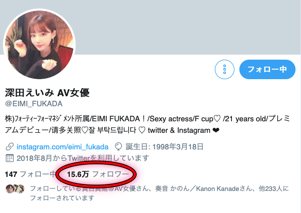 不用說,答案自然是旅韓就是神的深田えいみ(深田詠美),有個很重要的指標可以提供大家參考:自從她改造完畢、在去年8月重啟twitter後短短10個月的時間追蹤她的人已經超過15萬6000人,這有多恐怖呢?這麼說吧,經營twitter超過8年的天海つばさ(天海翼)已經不是她的對手,另一位始終充滿鬥志的老將友田彩也香也輸給她了~