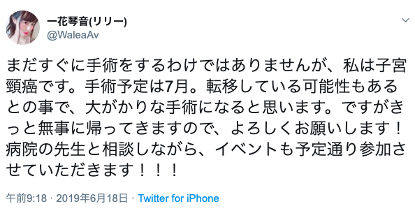 以芽森しずく(芽森滴)之名出道、曾在直播時吞下大量不明藥物讓影迷嚇一跳的女優「一花琴音」(前藝名宝生リリー,寶生莉莉)在twitter自爆罹患子宮頸癌,預定要在7月動手術: