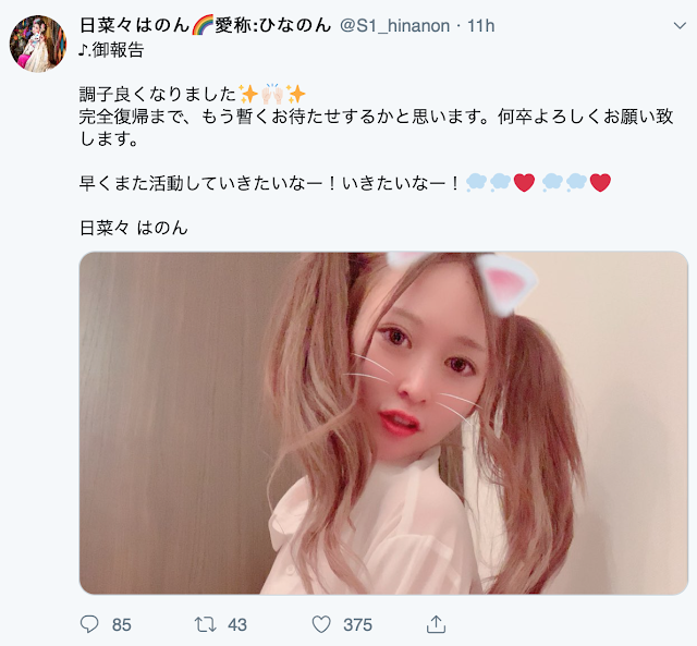 雖然葵的狀況渾沌不明,不過另一位也是片商S1專屬女優的日菜々はのん(日菜菜彩音)倒是出聲了,離開恵比寿マスカッツ(惠比壽麝香葡萄)後曾發文祝福前隊友的她在睽違兩個多月後又更新了twitter,除了和大家報告自己的身體狀況不錯,也明白告訴大家自己還想拼: