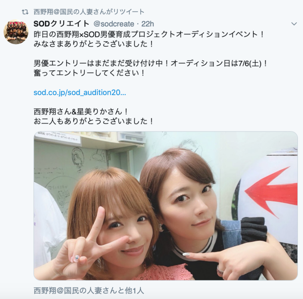 不是的,星美りか(星美梨香)是以特別審查員的身分參與這次徵選男優的活動:坦白說,我也覺得蠻奇怪的,在星美りか(星美梨香)的AV生涯中似乎和SOD和西野翔都沒交集,為什麼人家要選她當審查員?但看到她twitter的名字後面加上「活動復活」這4個字,怎麼樣?你是不是期待她重返淫光幕和男優大戰三百回合?