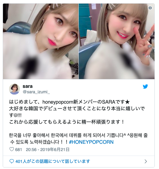 短髮造型、完全韓風的梳妝方式,比起三上悠亜和桜もこ(櫻萌子)更有韓團成員的感覺:只是改變了造型還是藏不住她的出身,就在現出廬山真面目後,有人發覺Sara就是之前アイドリング(美女甜甜圈!!!)的成員「橋本楓」ー