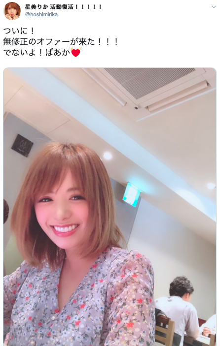 為什麼這麼說呢?因為才剛宣布「活動復活」的星美りか(星美梨香)證實自己收到無碼片商的邀約!