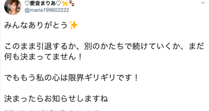 雖然有著相當亮眼的外型,不過愛音まりあ(愛音麻里亞)三不五時就會像現在一樣負面情緒爆發寫下很喪氣的東西,之前吉川蓮引退的時候她也在twitter大嘆不如歸去,去年年底她更是直接把twitter關了事後又說是操作錯誤,現在更是直接把「引退」兩字亮了出來:
