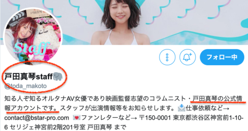她的名字怎麼變成「戸田真琴staff」了?而且自我介紹欄也告訴大家這個twitter已經變成「戸田真琴の公式情報アカウント」(戶田真琴的官方情報帳號),意思就是說戸田真琴人還在,但她不用twitter了,原先的帳號將會由事務所接手,大概就是PO些活動情報或是向大家報告這位想做導演的女優未來有什麼規劃…