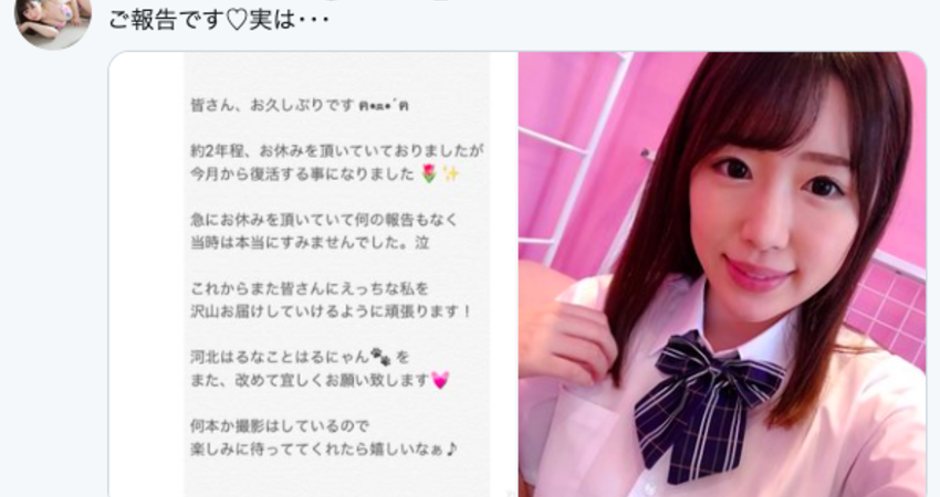 她是有實力而且胸前也有兩粒的,確定回歸後上傳到twitter的照片和影片看起來這兩年的離開並沒有讓她劣化反而更為誘人,以現在片商缺人的狀況,我想河北はるな(河北春菜)應該有發揮的機會~