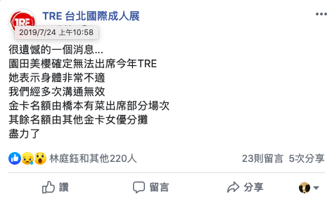 如果可以我也很希望這是愚人節的玩笑,不過沒辦法,這是個令人心痛的事實:TRE主辦單位及ForAVer大概是在7月10日左右收到消息,園田みおん(園田美櫻)因為身體病痛的關係,可能無法來到台灣參加活動,甚至有可能危及她的AV生涯!