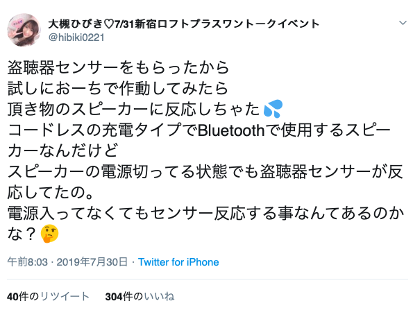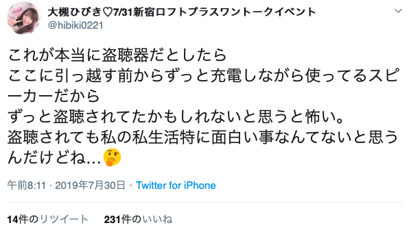 為什麼?因為她發現影迷贈送的喇叭疑似被裝了竊聽器:不管有沒有插電,用反竊聽器去偵測都有反應,她愈想愈恐怖,忍不住向假送禮真竊聽的影迷喊話:「我的私生活並不有趣,請不要這麼做~」