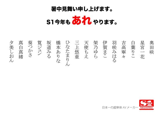 好吧,不知道你希望誰能和誰一起演出?我是蠻希望筧ジュン(筧純)和真白真緒兩位新一代神乳同場較勁比比看誰比較胸;也希望在FANZAアダルトアワード(FANZA成人大賞)同場得獎的大學姐天使もえ(天使萌)能和新一代性愛機器坂道みる(坂道美琉)合體榨乾男優;當然,還有一塊兒要來TRE台北國際成人展的超級好朋友三上悠亜及橋本ありな(橋本有菜),雖然之前就已經合體但相信S1還是會撮合她們一起演出,加油!