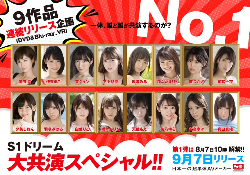 是的,與SOD STAR把11位專屬女優抓來在9月和11月各發1支作品不同,S1是狂轟猛榨,榨乾你的榨地一連發行9支作品:所以大概可以下結論了,首先,就和15週年慶的共演企劃一樣,S1是把女優各自帶開進行共演,可能會有最少2人組成的VR共演、也一定會有3人以上合作的DVD作品;第二,以S1的作風,最後少不了一支主力女優總動員共演的作品,以過去這家片商企劃的方式最多可能會有9人一起演出,能參與那支作品演出的就是菁英中的莖陰!