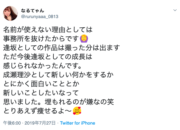 果然,沒多久重開twitter的她名字變成了「なるてゃん」,:能讓一個AV女優捨棄原來的藝名只有兩個原因,一個是她不玩了,不想再扮演AV女優這角色,另一個就和事務所關係破裂,藝名不能用了!