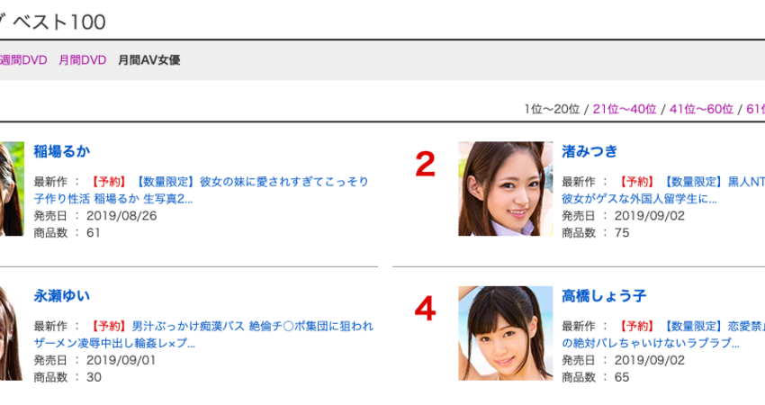 雖然高橋しょう子(高橋聖子)仍然是作品最賣的女優,不過在計算累積銷售量的「FANZA月間AV女優ランキング」排行榜她已經打不贏那些發片機器了:在才剛公布沒多久的7月排行榜是由稲場るか(稻場流花)登上冠軍寶座、第二名則是由貧乳美少女「渚みつき(渚光希)」拿下…