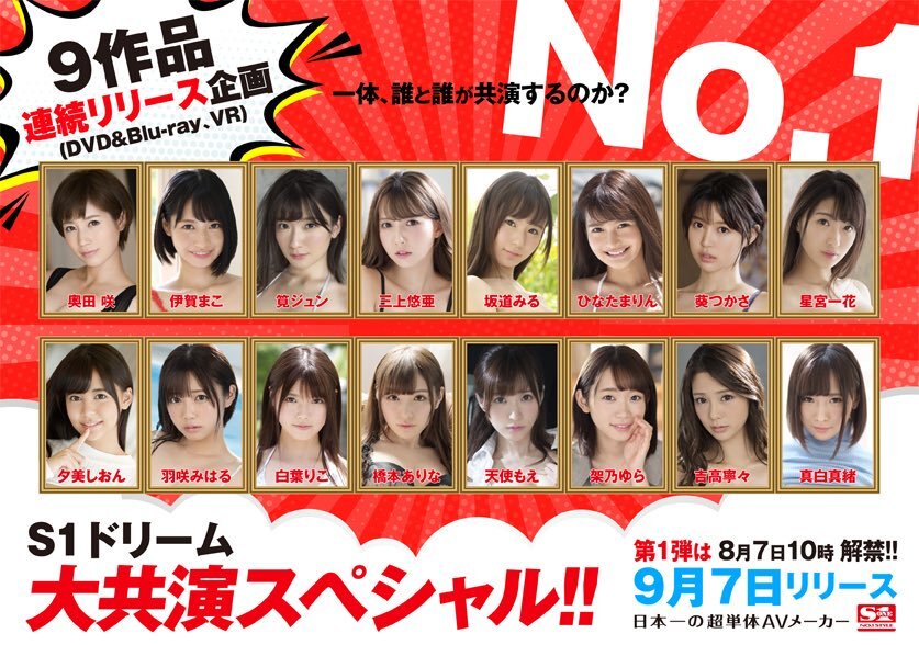 還記得在SOD集團推出「鋼鉄の11人」豪華共演後,另一家有邪惡帝國之名的片商S1也公布多達16人的夢之共演名單嗎?在上一篇文章筆者已經告訴大家這會是一個女優總動員、連續9支作品上架的大型企劃,而在今天,第一支作品出來了: