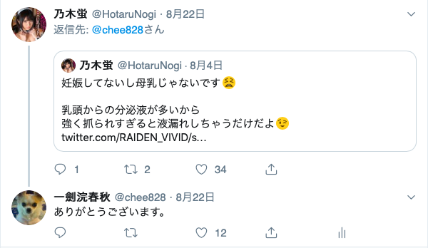 那天告訴大家乃木蛍在片中乳頭分泌出不明液體,沒多久女優本人就在twitter上回覆了: