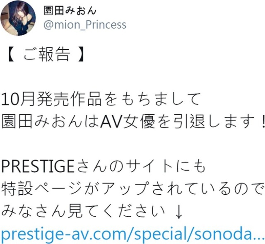 2019/09/02園田美櫻突然在推特發文宣布,說自己在10月發行最後一支作品後,將從AV女優身分引退。