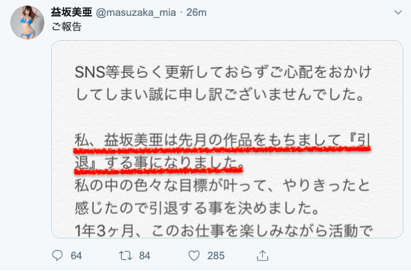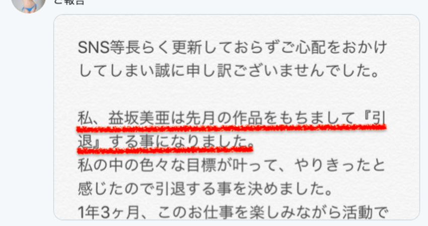 曾經是著名的寫真女星、自拍照老讓人誤以為是明日花キララ(明日花Kirara)的益坂美亜今天在twitter宣布了引退的決定,結束了1年3個月的AV之旅~