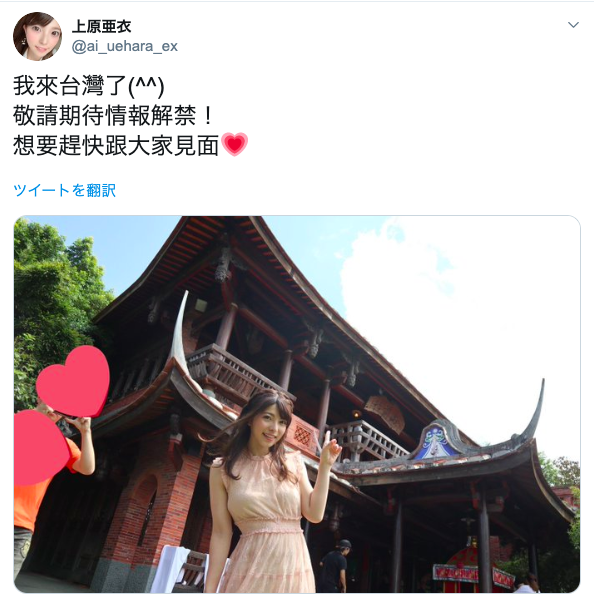 是的,上原亜衣不久前來到台灣了。