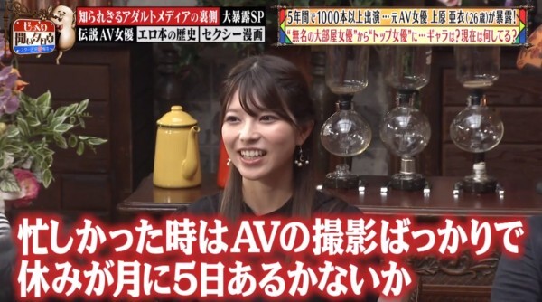 與一般女孩渴望當片商的專屬女優不同,上原亜衣在出道時就決定用大量拍片的方式拼經濟:有多瘋狂呢?以企劃単体女優身分縱橫AV界5年的她留下了超過1000支作品,最忙的時候一個月只能休5天假ー聰明如你一定知道那就是「休紅」、也就是大姨媽來了不能做,而且不只幾乎全月無休,就算生病了她也不休息,發著高燒醫院片場兩頭跑對她是家常便飯…