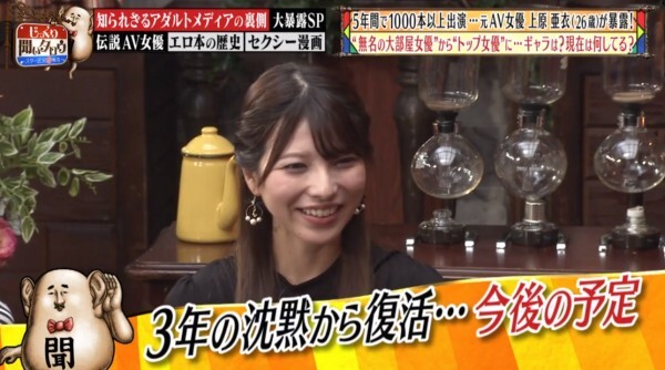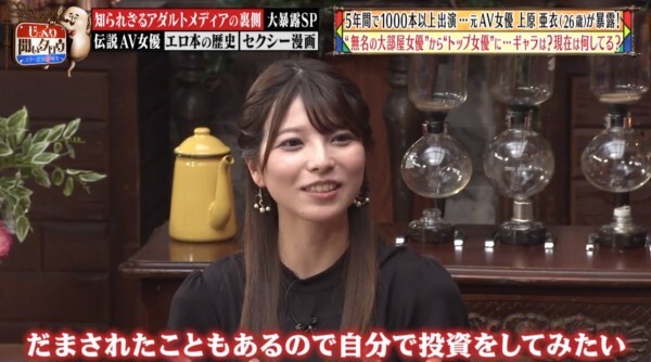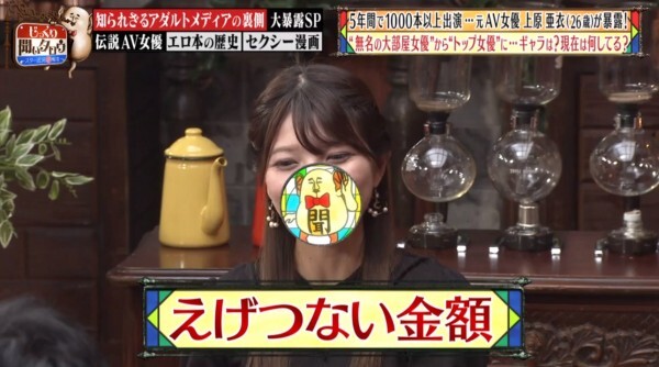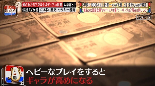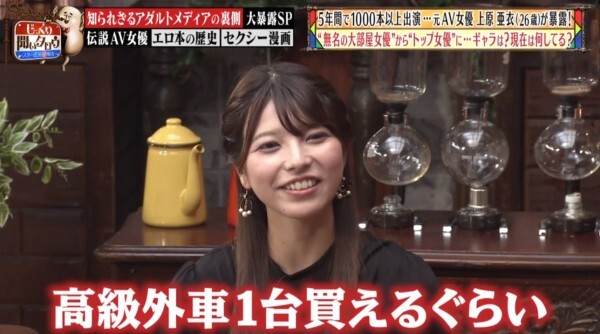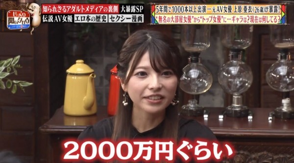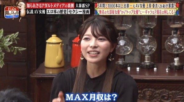 哈,我也不知道高橋しょう子(高橋聖子)的反應是節目效果還是沒想到単体企画女優能賺這麼多錢?其實上原亜衣並沒有在節目上公布自己一個月能賺多少錢,但我可以給大家一些參考的資料:記得已經引退的天野美優嗎?與之前介紹過的水川スミレ(水川蓳)一樣,她在發片全盛時期也是一個月可以拿到200萬日幣(約57萬台幣),當然,上述兩人遠遠不及上原亜衣的拍片數量、片酬也無法和拿到DMMアダルトアワード(DMM成人大賞)最優秀女優賞的這位大前輩相比,我覺得說月收千萬日幣(約台幣286萬)是小看她了,外傳她引退時手上有3億日幣(折合台幣8570萬元)並不誇張: