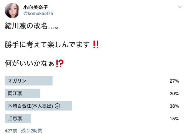 小向美奈子還替她辦了新藝名的票選,果不其然,她本人提出的新藝名「木崎百合江」最受影迷青睞,看來萬事俱備也不欠東風了,她應該很快就會和我們見面~