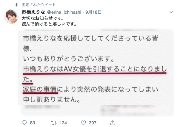 但,家庭因素,毀了所有事務所的計畫、也讓市橋えりな(市橋惠理奈)決定完全引退: