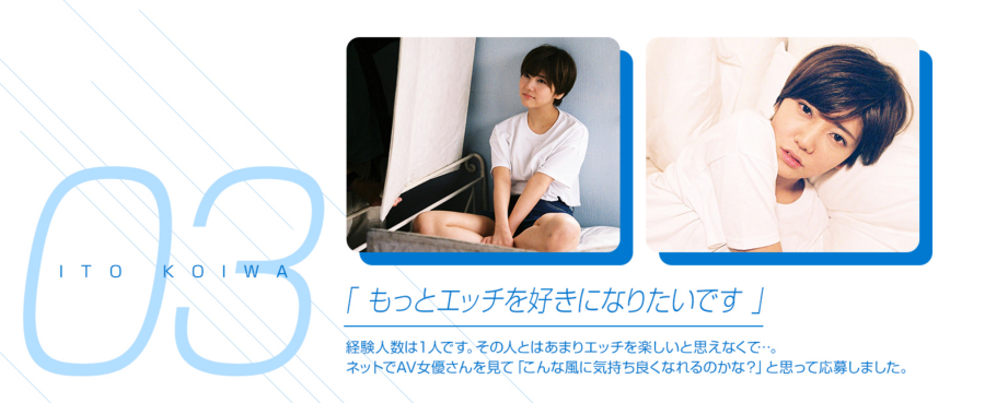 好吧,那不重要,重點是小岩いと(小岩伊都)何德何能、可以成為KMHR改版後的開山祖師爺?根據片商提供的資料,這位短髮俏麗的大學生之前只和一個男生上過床,經驗非常少,有可能是因為她外型看來非常帥氣,讓男生覺得她是哥們而不是妹子,但實際上這位新人的內心非常女生,而且喜歡料理、每天都在跳繩的她其實蠻喜歡做愛的…
