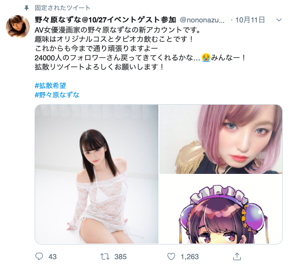 應該有不少朋友發現了,SOD青春時代出道、一面當女優一面畫漫畫的野々原なずな(野野原薺)換了twitter帳號。