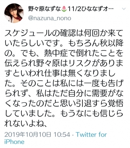 也許有人為野々原なずな(野野原薺)抱不平,不過日本影迷並不同情她,因為有人爆料她在中暑取消工作的隔天就跑出去玩還上傳照片給大家看,所以事務所才要更改合約要她如果再出現相同狀況必須自行賠償片商損失…