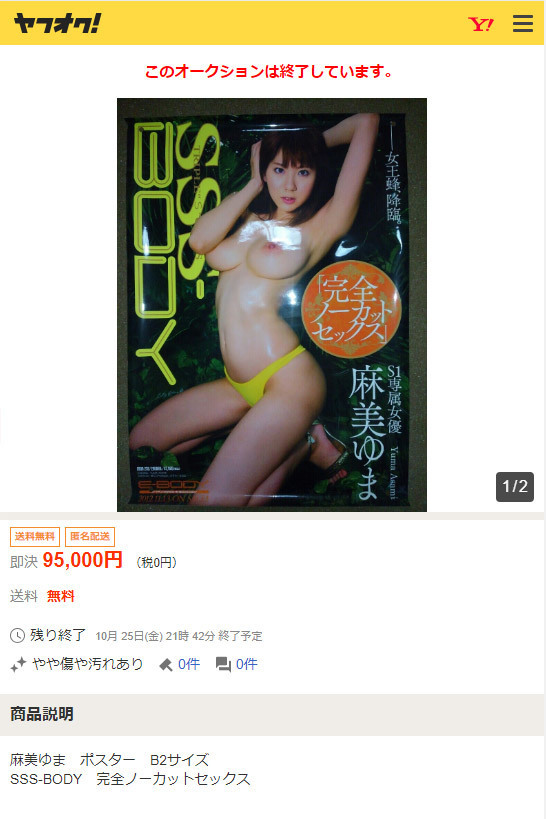 這是作品「SSS-Body」的海報,在日本雅虎拍賣飆到了95,000円的高價(約台幣26500元),而另一張在2007年12月發給各片舖張貼的海報則是喊到了差不到2萬日幣(約5600台幣)的高價。比起很多女優的作品三個月後就在二手店成了沒人要的垃圾,只能說麻美ゆま(麻美由真)真的是女神、是大家共同的回憶〜