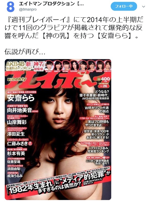 葵的新事務所、也就是讓她改名為小野夕子的8MAN在昨天晚上於官方twitter放了這麼一張照片,那是週刊プレイボーイ(PlayBoy)2014年第26期的封面,封面女郎是誰?正是當時準時發售寫真集的「安齋らら(安齋拉拉)」: