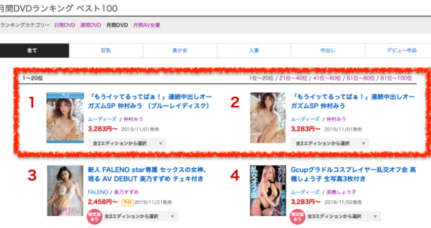 實體片的部分是由仲村みう(仲村美羽)在Moodyz的作品『「もうイッてるってばぁ!」連続中出しオーガズムSP』拿下冠軍,要不是深田えいみ(深田詠美)現在人氣和買氣太強要不然我認為計算作品銷售總和的AV女優排行榜她也應該拿下冠軍。但看到下載排行榜你可能會嚇一跳,因為是支很不一樣的片子: