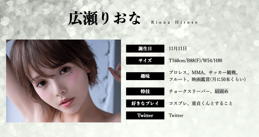因為広瀬りおな(廣瀨里緒菜)真的太S了:光看基本資料的興趣欄就能感覺到這位女優和其他人不一樣,一方面她喜歡看摔角、格鬥技等搏命的運動,另一方面她卻又喜歡吹長笛和看電影,似乎是個可以勇敢也可以溫柔的人;但仔細看看這位新人的特技以及喜歡在床上的玩法就會覺得她好可怕: