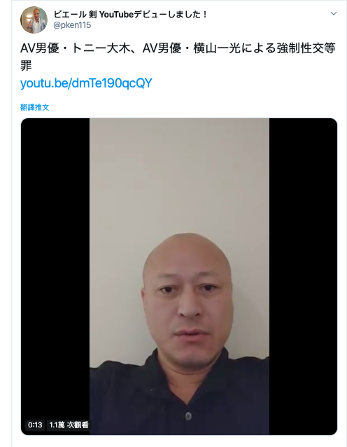就算不懂日文,看到標題「AV男優・トニー大木、AV男優・横山一光による強制性交等罪」也知道出事了:沒錯,ピェール剣(Pierre劍)指控兩位同樣是AV男優的トニー大木(東尼大木)及横山一光強暴他的女友,影片的內容就是兩位男優向被害女性謝罪:
