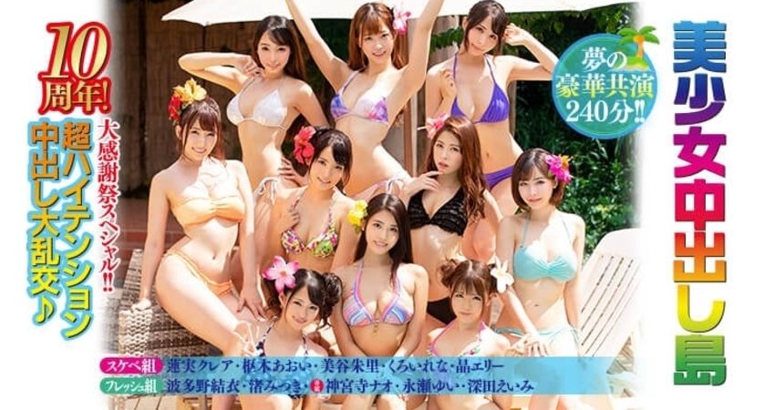 為了慶祝成立十週年,這家片商是讓名作「美少女中出し島」復活並且一口氣邀請10位女優分組競爭,誰能夠榨出最多的洨朋友誰就淫了: