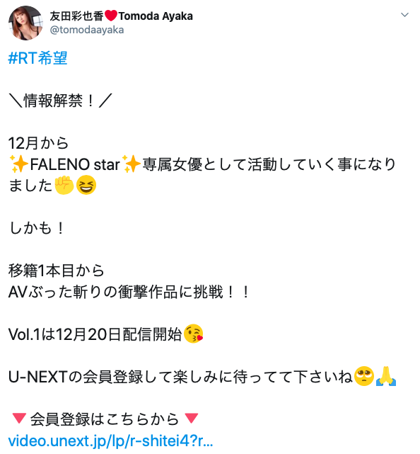這結果真是出人意料卻又有其意義:首先,事務所也知道友田彩也香對他們的意義所在,所以無所不用其極地幫她尋找願意給專屬契約的片商,最後獲得了令人滿意的結果;第二,身為U-Next集團的扛霸子,友田彩也香的新東家FALENO擴展版圖的企圖心遠比大家想得強烈,不只新人一個接一個出道並且捧出了11月最強新人美乃すずめ(美乃雀),現在也引進有資歷有知名度而且外型保持良好的友田彩也香,而這也是他們第一個移籍而來的女優(我當初就是沒想到它們會收移籍的女優所以失算了)⋯