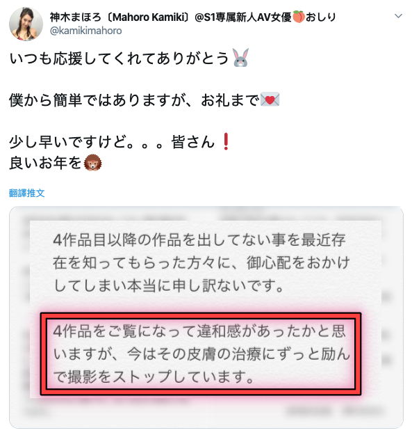神木まほろ(神木真秀)的狀況是她病了, 在twitter上她告訴大家, 因為皮膚出了狀況所以她在拍完的第4支作品後已經暫停拍攝工作, 甚至她也明說了, 問題不是在拍完作品後才發生,所以大家在欣賞那支「むっちりハミ出し美巨尻」時就可以發現她生病了……