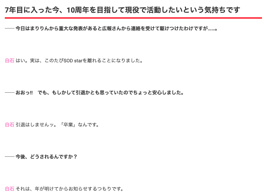 不信?一塊兒來看看她接受網路FANZA採訪時是怎麼說的吧:文章標題就已經講了,她沒有引退,只是自SOD集團畢業,之後的動向會在今年(2020)年初和大家說明;另外,她的目標是要在這一行待滿10年,她是2013年出道的,所以除非出了什麼讓她打不下去的亂子或是這一行殘酷到3年內就讓她混不下去,要不然到2023年之前我們應該都還看得到她⋯