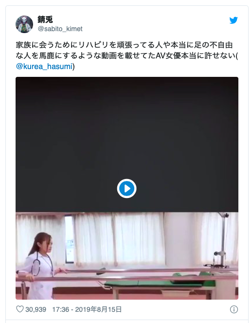 蓮実クレア(蓮實克蕾兒)是和另一位女優桐嶋りの(桐嶋莉乃)玩開了,身著護士服的兩人用奇形怪狀的方式走路搞笑。只是她們玩得開心卻有人覺得不好笑,沒多久就有人轉推她的發文說家裡有人辛苦復健想好好走路卻看到AV女優自以為幽默模仿搞笑,這不是歧視什麼才是歧視?