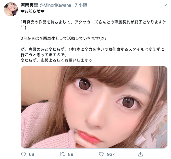 就等1月17日開獎吧。但近期女優狀況有變的可不只吉高寧々一人,去年來參加TRE台北國際成人展、也是片商アタッカーズ(Attackers)專屬女優的河南実里剛剛在twitter上宣布,在這個月(2020/1)的作品「先輩たちの怒りを買って集団イジメの対象になり、更にはセクハラ上客用の淫らな生贄となった新人生保レディ」後她就要結束與アタッカーズ(Attackers)的合作關係,恢復成企劃女優: