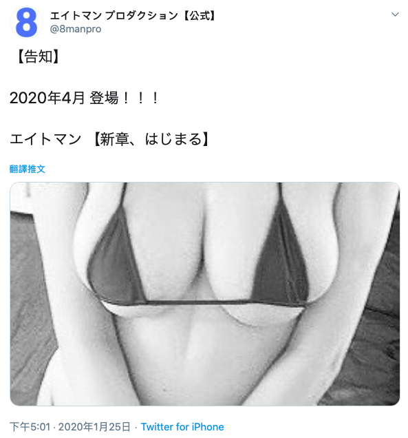 他們在官方twitter上放了這一張照片,上面寫著「2020年4月 登場!!! エイトマン 【新章、はじまる】(2020年4月登場!8MAN【新章、開始】)」,光看這乳量就知道此人龍非池中物,勢必不同凡響⋯