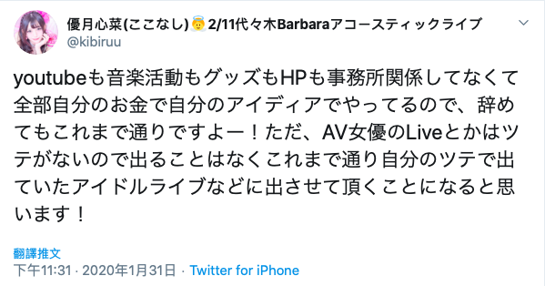 雖然不能說每天都在發生,但這年頭女優和經紀公司翻臉已經不是新聞了,像去年,橋本ありな(橋本有菜)就因為合約談不攏差點離開了原先的經紀公司Arrows,而岬ななみ(岬奈奈美)更是因為不滿「賺太少」而先後和兩家事務所吵架甚至關閉聯絡管道。優月心菜雖然沒有明言發生什麼事,不過從她一連串推文完全沒感謝事務所甚至還強調YouTube頻道、音樂活動及商品設計都是自己掏腰包做的,我看裡面大有文章: