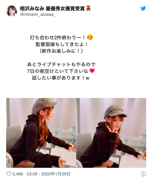 一連串的行程相信有追蹤她的朋友都看得很清楚,先是與監督面試討論演出的劇情,接下來她花了一整天的時間(2/1)拍片,最後還不忘點出「アイポケ真是太棒了」ー所以可以確定了,相沢みなみ(相澤南)不只重返發片崗位而且仍然是片商ideapocket的一員,雖然遲了幾個月,但她還是原來的那個她!