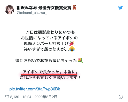 那倒是不用煩惱,相沢みなみ(相澤南)從頭到尾都沒有放棄她的事業,在調整好心情、新社長就位並且自原先的44Group獨立出來後重回片場只是時間的問題。而在月初,她明白地在twitter上告訴大家,自己重返發片崗位了: