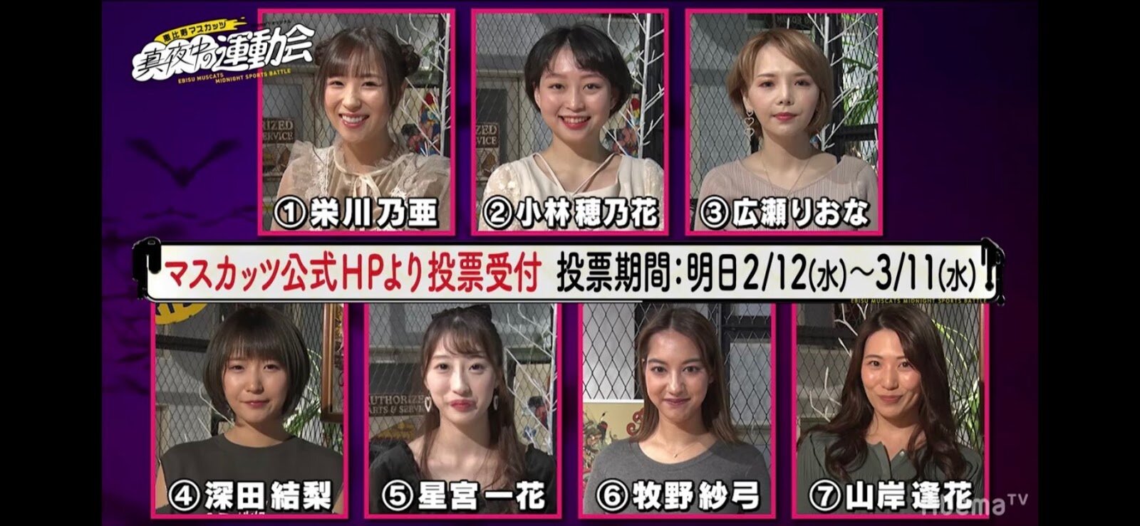 一共有七個人,依照主辦單位給的編號列下來:分別是1號的栄川乃亜、2號的小林穂乃花、3號的広瀬りおな(廣瀨里緒菜)、4號的深田結梨、5號的星宮一花、6號的牧野紗弓以及7號的山岸逢花,從今天開始到3月11號,你可以上恵比寿マスカッツ(惠比壽麝香葡萄)的官網投票,前3名就可以加入恵比寿マスカッツ(惠比壽麝香葡萄)〜