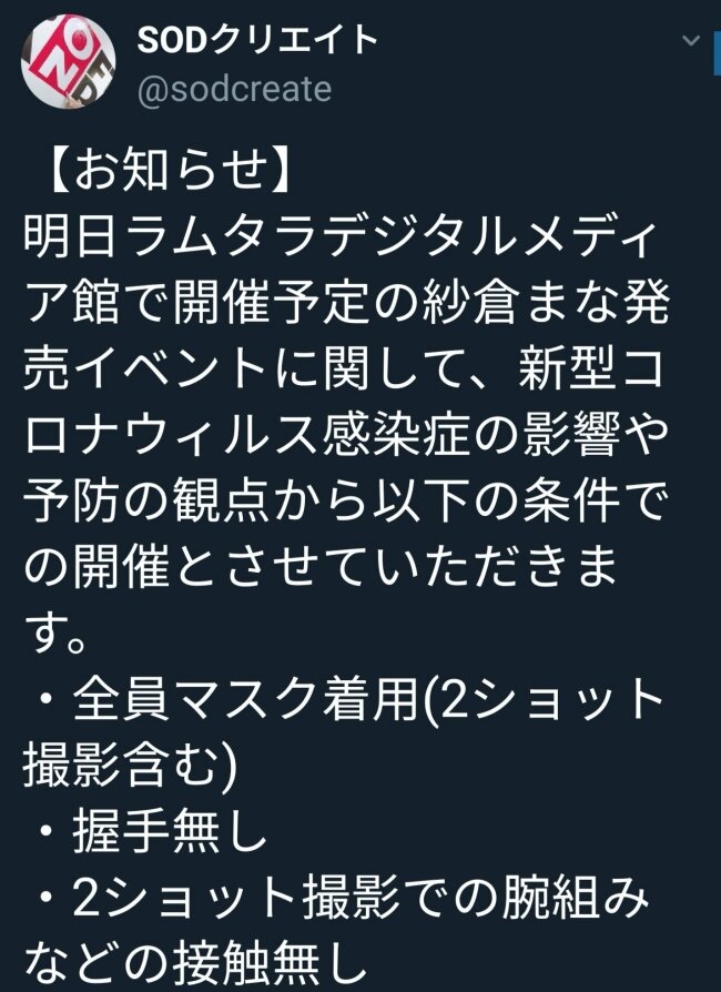 拿紗倉まな(紗倉真菜)的活動來說好了,因為肺炎的關係,主辦的SOD集團做了以下三個改變,小弟我簡單條列如下: