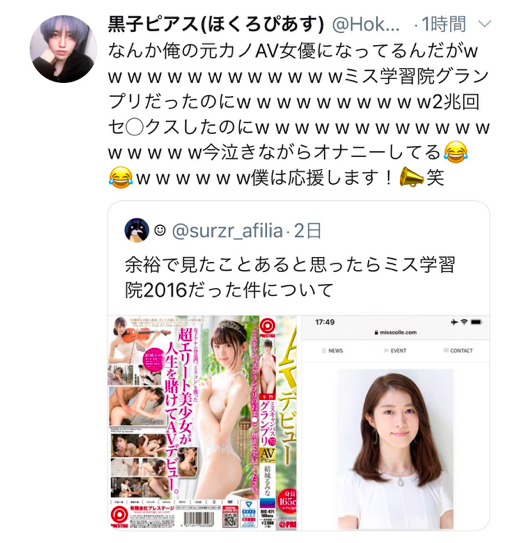 原來是在前天的時候,結城るみな(結城瑠美奈)回了一篇「黒子ピアス」的貼文,這人的貼文寫說看到前女友去當AV女優就像是一場美夢,然後附了一段某人疑似劈腿被抓到被女友追打的影片: