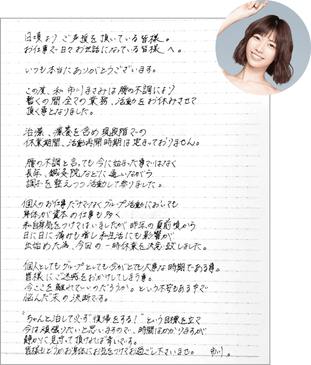 根據SOD集團的說法,身為恵比寿マスカッツ(惠比壽麝香葡萄)隊長的她因為比誰都拼,身體逐潮承受不住高強度的舞步訓練以及表演行程ー從去年下半年她就一直受到腰傷的困擾,到了今年已經嚴重到連日常生活無法自理,所以她做出了痛苦的決定: