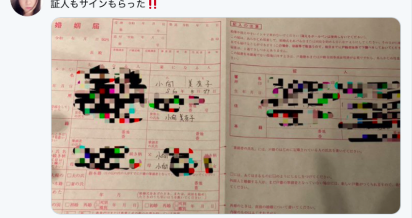 是的,曾經是藝能界最受注的寫真女星、曾經是AV界最大的風暴、也曾經因為吸毒入獄的AV女優小向美奈子結婚了,昨天(2/28),她於twitter上傳了結婚證書,從今天開始,她就是人妻了!