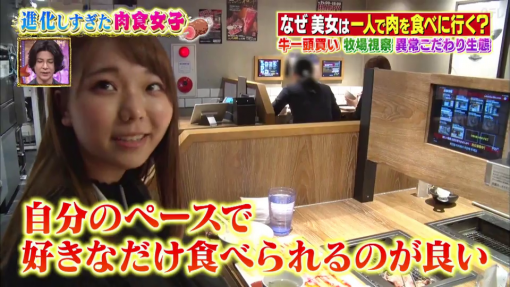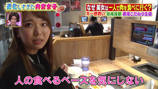 那和成人世界無關,是新聞節目討論「一人烤肉店」的興起,結果一個人去吃烤肉的稲場るか(稻場流花)受訪侃侃而談,她說自己一個人吃烤肉很方便,想吃什麼就吃什麼,不用配合其他人的步調,快樂的不得了〜